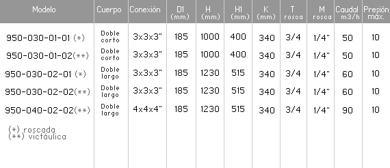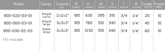 . Cuerpo doble largo: 3" 60 m3/h, con pérdida de carga de 0,3 bar.