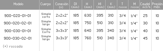 . Cuerpo simple largo: 3" 45 m3/h, con pérdida de carga de 0,3 bar.